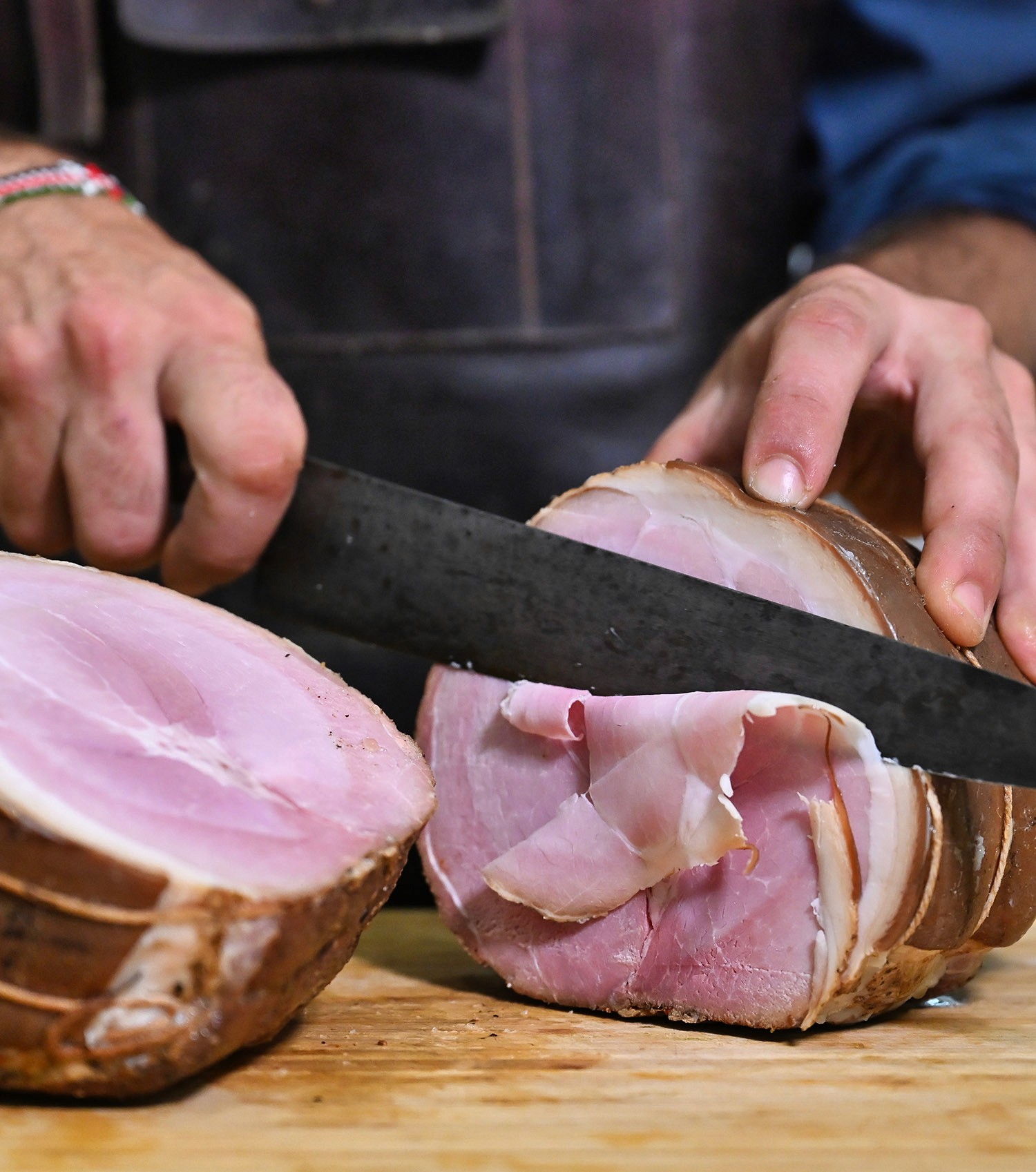 The prized back muscle of the pig’s thigh, carefully trimmed, salted, and hung for at least twelve months. It develops a supple texture and elegant sweetness – the reward of long, patient ageing.