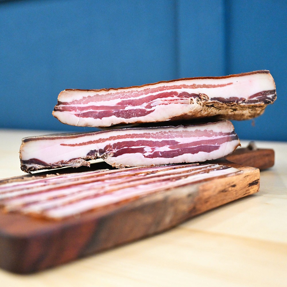 Pork belly cured with sea salt, pepper, and warm spices, gently smoked and hung to age. The result is rich and aromatic, with silky fat and balanced notes of smoke, spice, and sweetness.