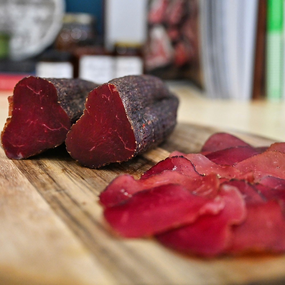 An air-dried, salted beef muscle, the eye of round, known for its exceptional leanness and fine, tender texture. Brined in red wine and warm spices, each piece is carefully dried and aged for a minimum of three months. The result is a delicately sweet and aromatic cured meat, deep red in colour and rich in character.