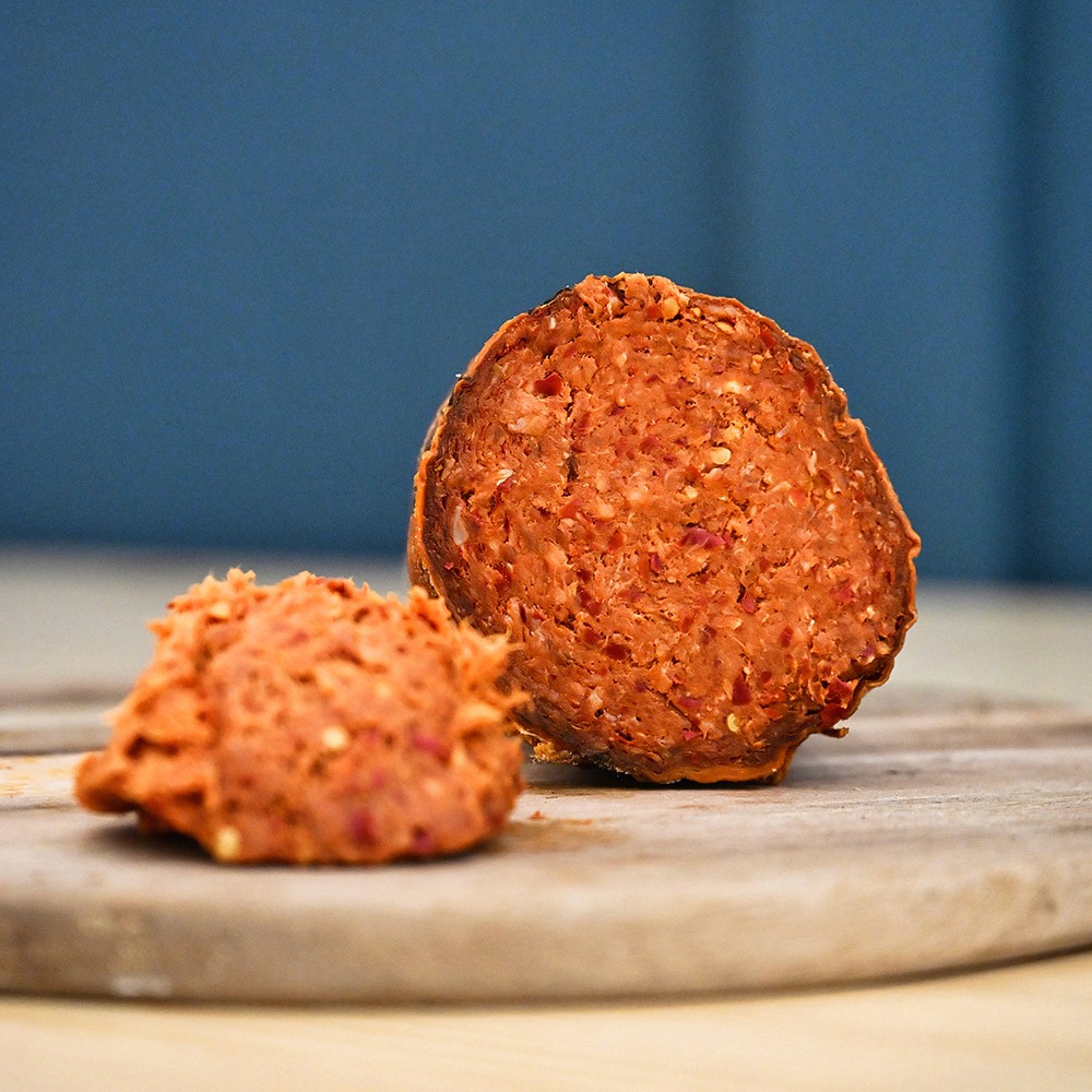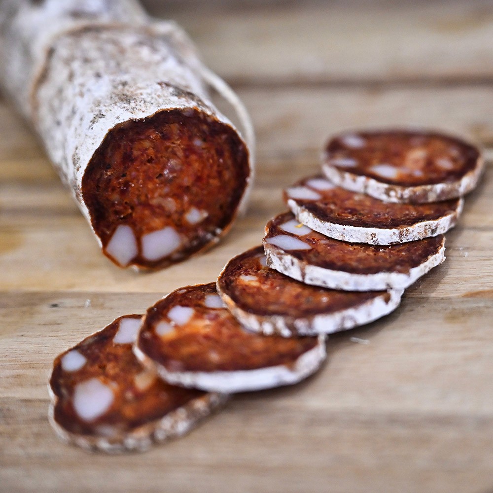 Made from pork ham and hand diced back fat, coarsely minced and seasoned with smoked paprika, garlic, and a touch of wine. The sausage is slowly cured to allow the flavours to deepen and the colour to take on a warm, natural red. Each slice offers a gentle smokiness and a balanced spice, rich yet refined.