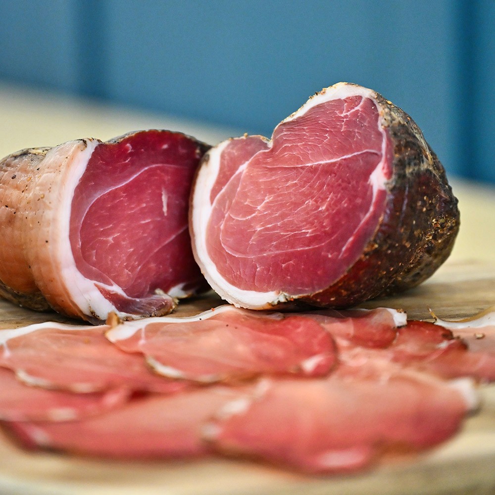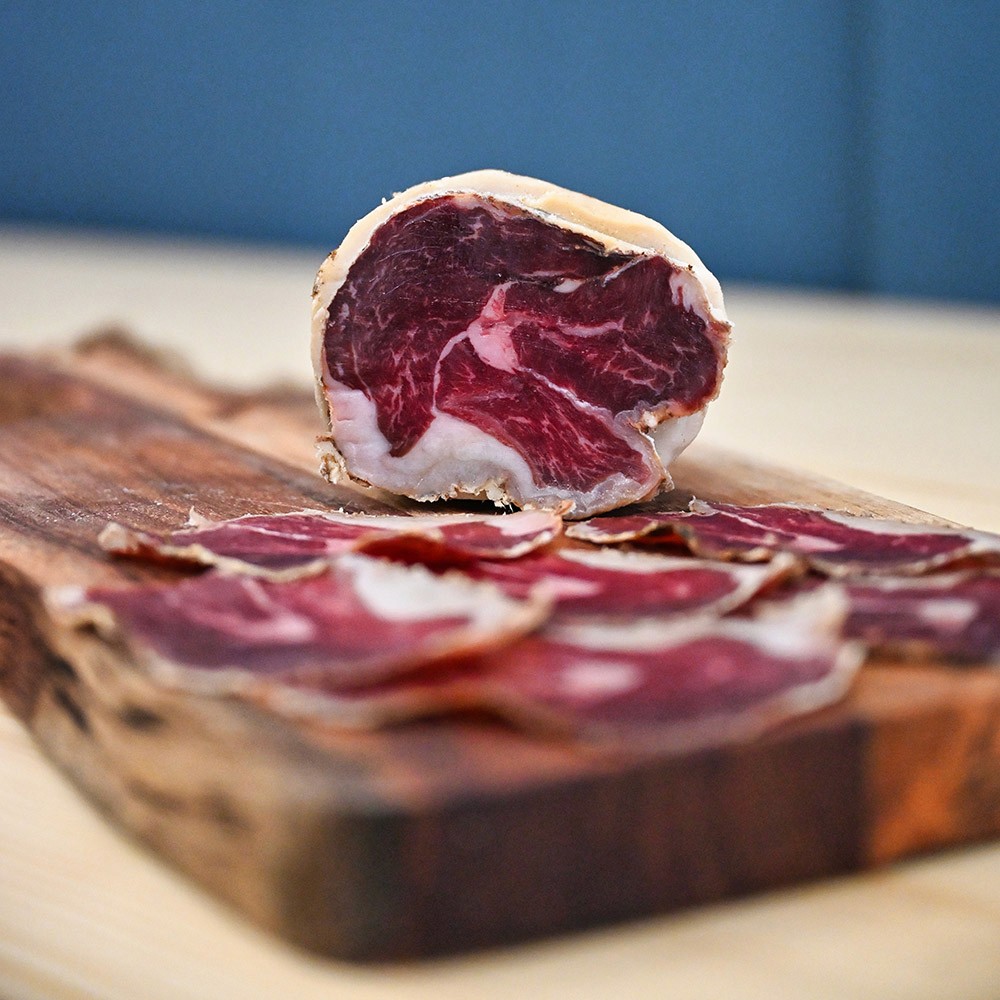 From the neck and upper shoulder, richly marbled and full of flavour. Seasoned with sea salt, pepper, and spices, then cured slowly until tender. The long ageing develops a deep savoury warmth and gentle sweetness that show the beauty of slow work.