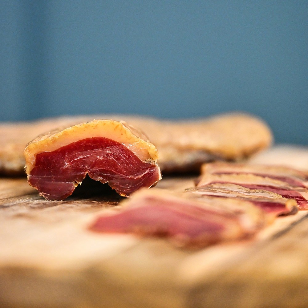 Prepared from the magret of duck, cured with sea salt and fragrant spices before being air-dried to a silky, marbled finish. The rich, dark meat develops a gentle sweetness and a subtle aroma reminiscent of aged ham, offering depth and balance in every slice.
