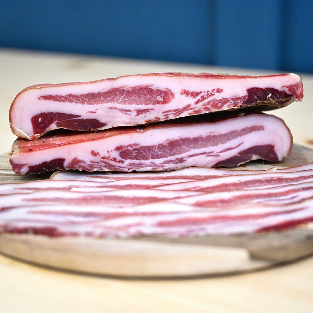 From the pork jowl, trimmed and seasoned with sea salt, black pepper, and aromatic herbs. Lightly cold-smoked over beech then hung to mature, it develops a rich, savoury depth and a gentle sweetness. When sliced and rendered, it releases a remarkable flavour.