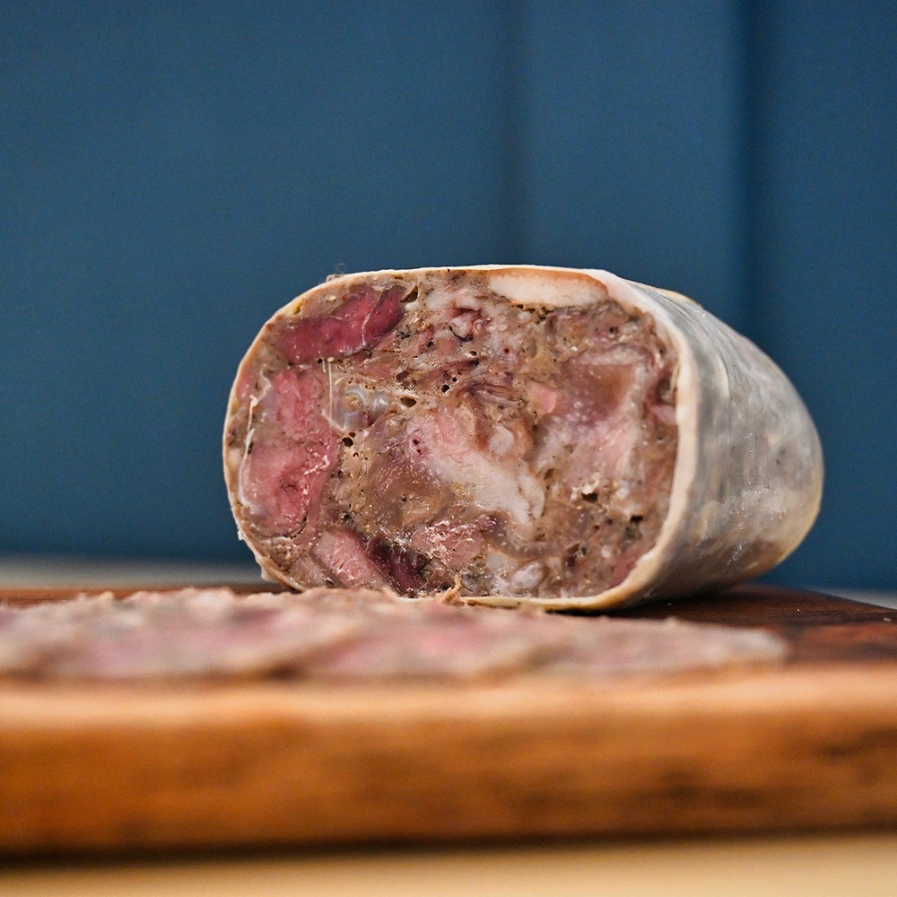Made from the meat of the pig’s head, gently poached in rich broth and seasoned with warm spices and herbs. Once cooked, the meat is pressed into natural casings and left to set into its marbled form. Sliced thin, it’s tender, savoury, and delicately balanced – a true expression of whole-animal craft.